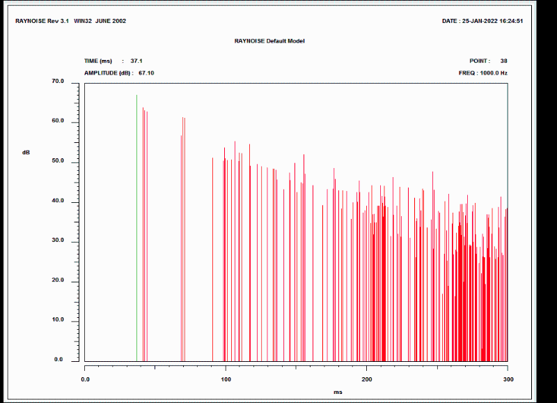 从计算机仿真模拟结果可以看出,T30云图分布较均匀,各接收点的平均混响时间中频(500 Hz、1 000 Hz)平均值为1.14 s,空场计算值为1.16 s,计算机模拟结果和计算结果较符合,混响时间频率特性一致。并且从选取的接收点反射声序列图可以看出各点无回声音质缺陷。