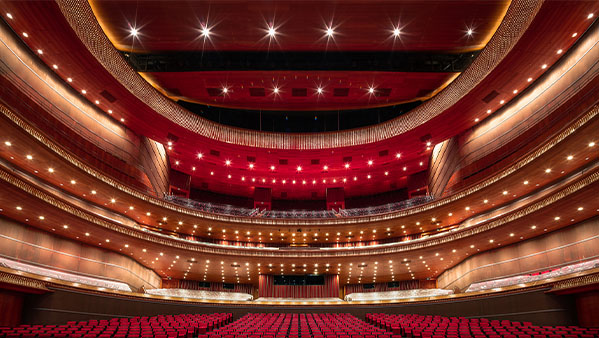 剧场内部装修设计采用古典的欧式设计,整个内部装修充满古典主义的美感和奢华,这样的设计使得舞台两侧没有传统的八字墙,一般的线阵列或者点声源扬声器都无法安装,同时多达5层的观众席给扩声系统 的设计带来了巨大挑战,为了将发烧的音质享受带给剧场内每一个角落的观众,并且避免复杂的墙面结构及观众席护墙给声音造成的建声干涉。